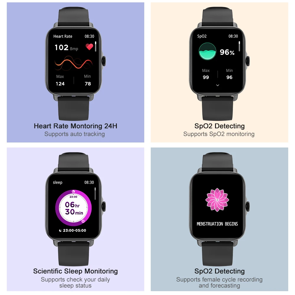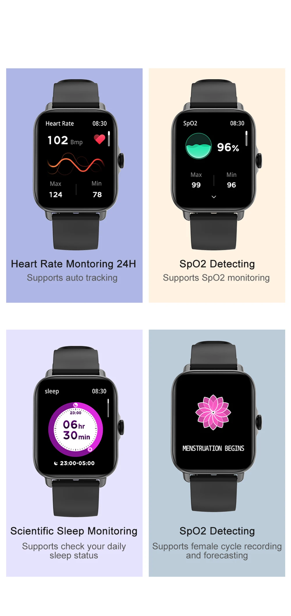> Health: 24/7 Heart Rate monitor, Blood Pressure, Blood Oxygen, Sleep tracker, Breathe, Drink water reminder, Reminder to move, Women’s menstrual period reminder, Support health APP.