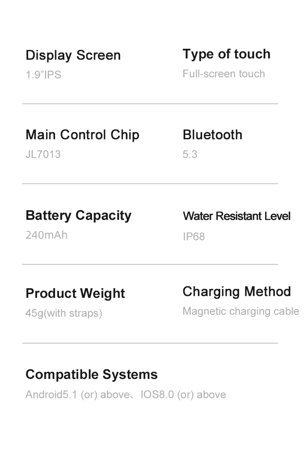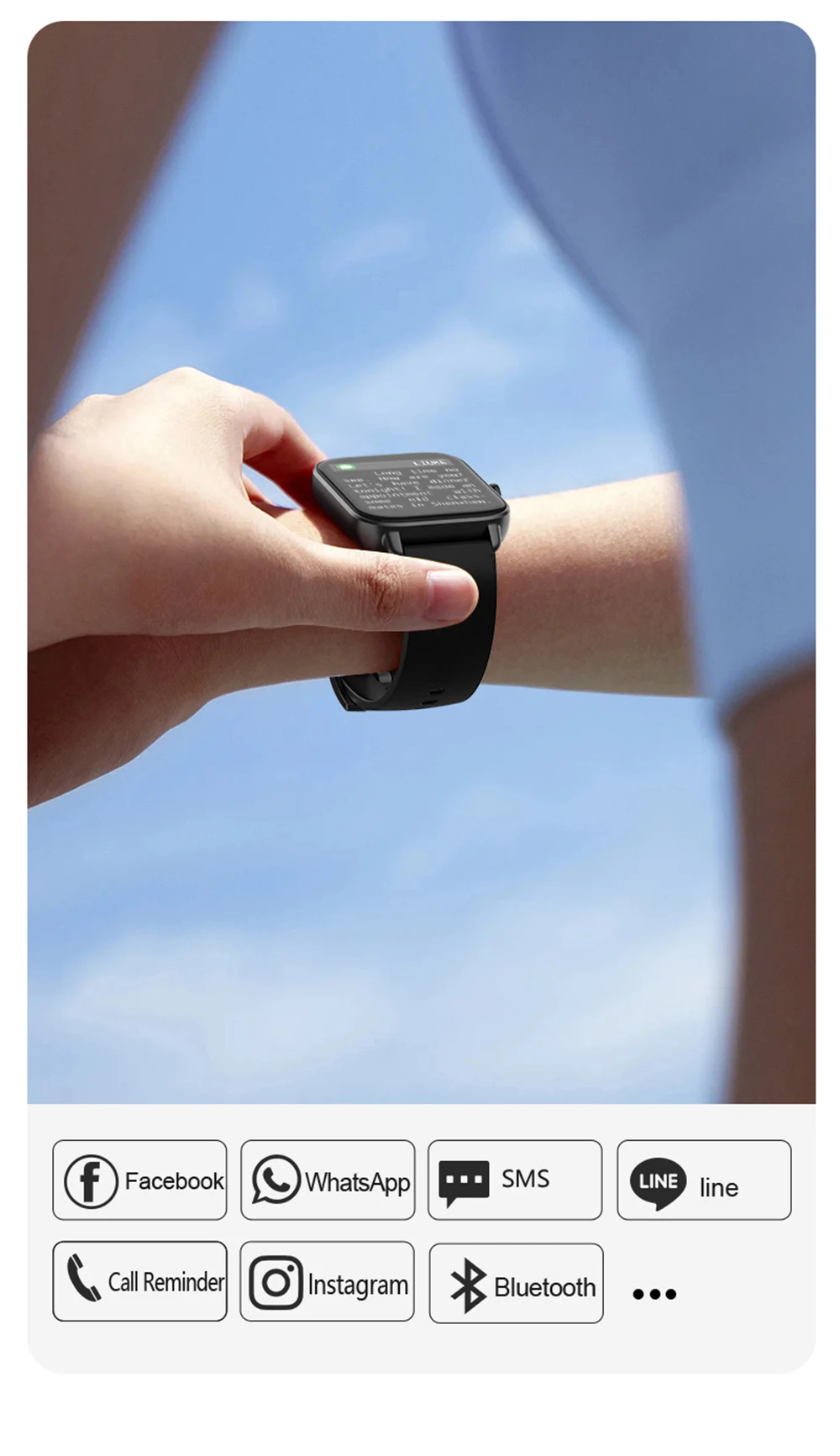 > Life: Bluetooth Answer Call, Bluetooth Dial Call, Messages Reminder, Alarm clock, Weather, Music remote, Camera remote, Flashlight, Find phone, Dynamic watch face, watch face market (100+ watch faces), custom watch faces(you can set the picture you like as the watch face), Set the screen off time, Do not disturb mode.