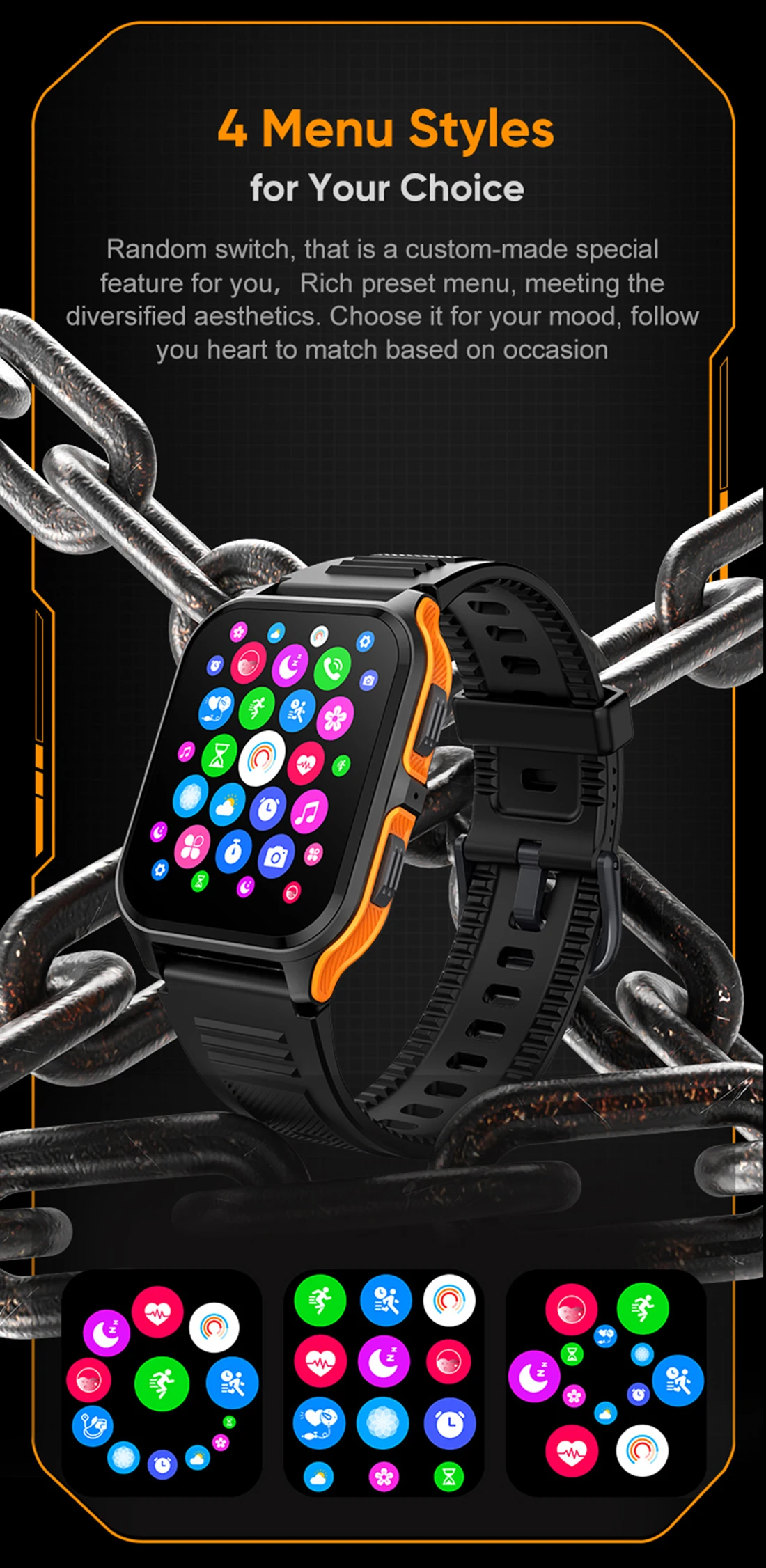 Activity Record( Steps, calories, distance), Sport Goal, 100+ Exercise Modes, Sports Data Report, IP68 & 3ATM waterproof.